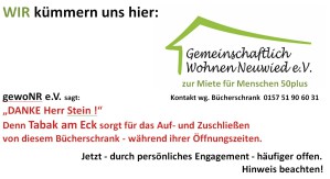 Es begann vor mehr als 10 Jahren, denn damals suchten wir den ersten Citymanager Jochen Tautges auf und boten an, dass gewoNR e.V. Kümmerer eines Offenen Bücherschrankes werden wollte. Von Anfang an nachhaltig dabei Ilse Wichmann und Ursula Koch. Wie auf unserer Homepage wahrnehmbar (https://www.gewonr.de/wir-aktuell/der-weg-in-unser-wohnprojekt/der-weg-bis-zum-kooperationsvertrag/) blieben wir erfolgreich am Thema drann - 2016 wurde eröffnet!